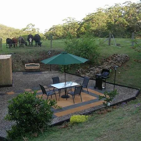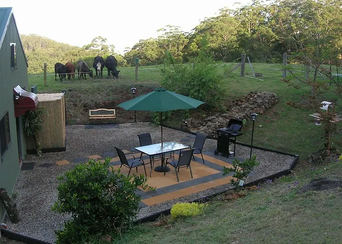 The villa includes a dining area with a microwave oven, an electric kettle, and a refrigerator. The closest airport is Sunshine Coast, located 75 km from the 1-bedroom farm stay. The surrounding area features hiking.